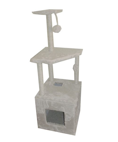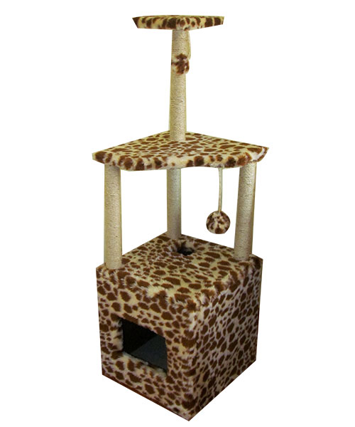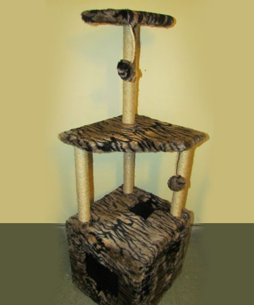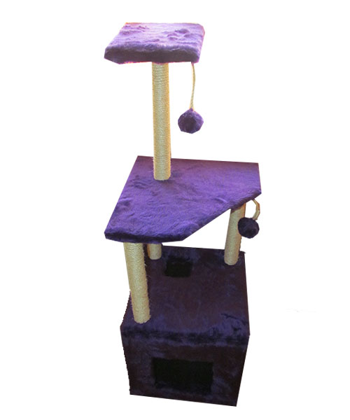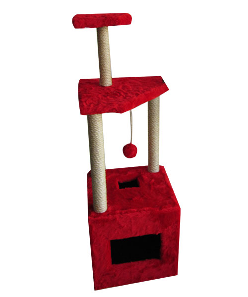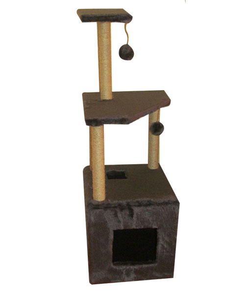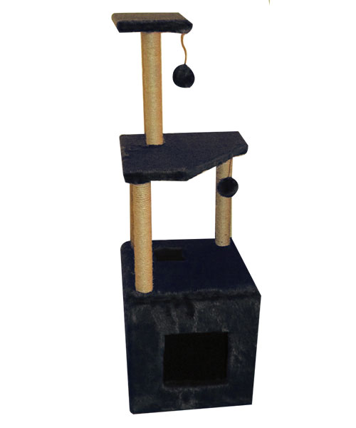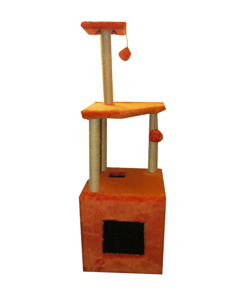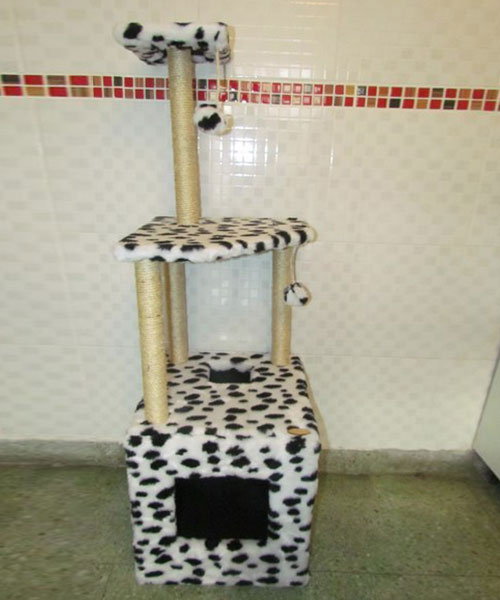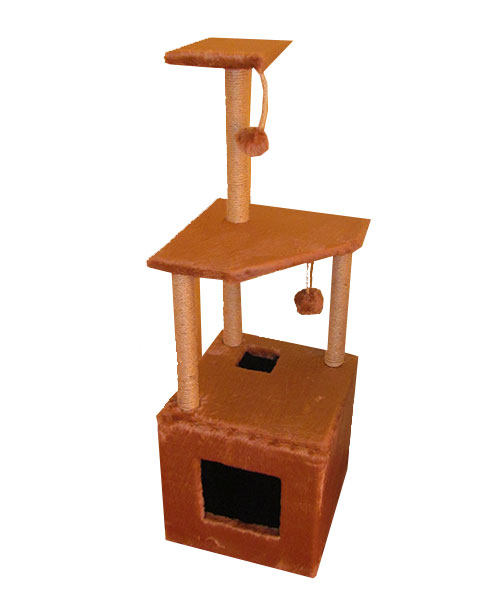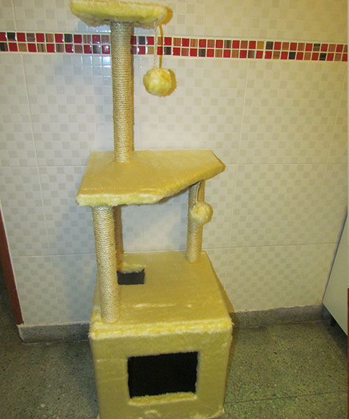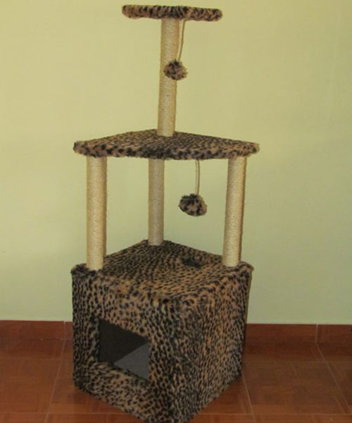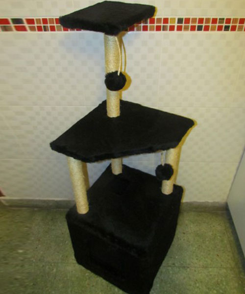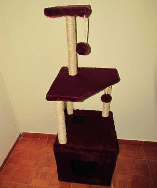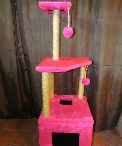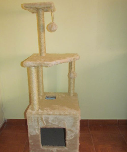 Rascador con 1 cucha grande con salida superior para jugar a las escondidas, 3er piso con tarima sobre postes rascador, 2 juguetes y 2do piso sostenido por 3 postes rascadores que lo hacen tan estable como un mueble! Muy resistente al peso. Ideal para gatos juguetones e inquietos que les encante trepar alto! No se tumba con nada! También para gatos grandotes ya que debido a su tamaño entran cómodos! Postes rascadores bien expuestos para que pueda rascarse con todo! Sirve para más de 1 gato. Base de 40x40cm, casa de 40x40x40cm, 4 postes rascadores de 40cm de alto de soga sisal, 2do piso con tarima grande y 3er piso con tarima de 20x25cm. Escalerita opcional: la recomendamos para gatos pequeños porque resta un poco de espacio en la tarima del 2do piso. Altura total del rascador: 1.25metros.